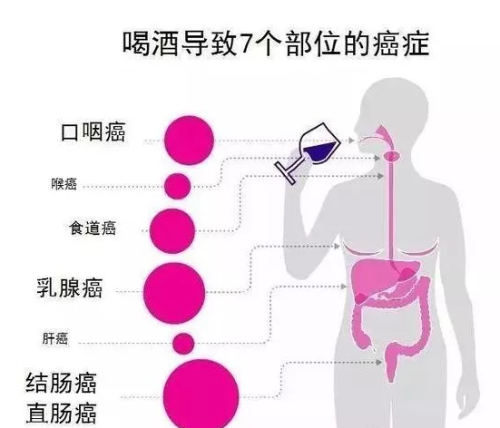 饮酒和很多种癌症都有密切关系,包括口腔癌,喉癌,食管癌,乳腺癌,肝癌,结直肠癌等。事实上,全世界5.5%的癌症发生和5.8%的癌症死亡是酒精引起的,也就是说每18个癌症里,就有一个是喝酒喝出来的。