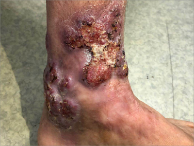 着色芽生菌病是由一组暗色真菌引起的皮肤及皮下组织慢性感染,常见于户外活动和赤足者(如农业、林业劳动者)。着色芽生菌病好发于腿部,起初为丘疹、结节,结节增多、融合、破溃而形成溃烂,溃烂面有污痂,揭开痂后可见粉红色肉芽,伴有黄白色脓液,自觉疼痛,有臭味。