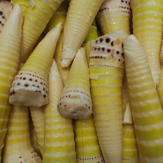 竹笋分布于长江流域及南方各地,含蛋白质、氨基酸、脂肪、糖类、钙、磷、铁、胡萝卜素和维生素B1、B2、C等成分,能促进肠道蠕动,帮助消化、去积食、防便秘,具有开胃健脾、通肠排便、美容护肤等功效。