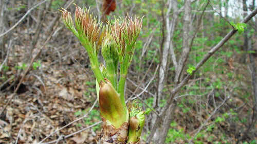 刺老芽为五加科楤木,生于林缘、灌丝、林中空地。春季采嫩芽、嫩叶,鲜用、盐渍、罐装保鲜。将其用沸水焯一下,换清水浸泡2小时,炒食、凉拌、蘸酱、裹面糊油炸均可。具有增加食欲、改善情绪、活血利湿的功效。