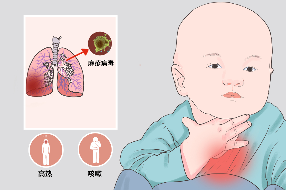 麻疹病毒肺炎是因麻疹而起的一种并不常见的急性病,也是最常见引起病变恶化的并发症,主要以婴幼儿及免疫力低下者为多,多发生在出疹前和出疹期。临床表现为呼吸道症状明显加重,常高热持续不退,咳嗽加剧,呼吸急促、鼻翼煽动、发绀。约1/3的患者合并细菌感染,以肺炎球菌、链球菌、金黄色葡萄球菌和流感杆菌多见,少数患者还可合并腺病毒和巨细胞病毒感染,是病情更为严重。本病的主要治疗以消除肺部感染发生的并发症为主,经积极治疗后预后良好。