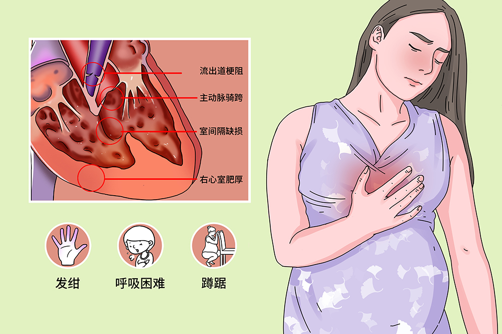 妊娠合并法洛四联症典型症状有发绀、呼吸困难、缺氧性发作、蹲踞,部分患者还可出现杵状指。本病可导致感染性心内膜炎、脑脓肿、严重肺动脉返流及三尖瓣返流的并发症。