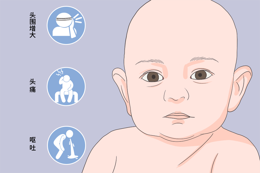 脑积水:头围增大、落日眼征、前囟张力高及骨缝分离等脑积水。