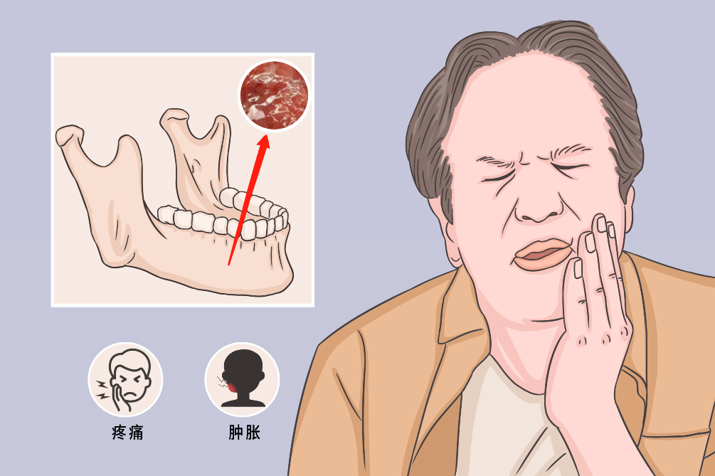 急性期可出现全身高热、寒战的症状。面颊及口腔疼痛剧烈,并放射到头面部。出现牙齿松动,不敢咬合。患处牙龈红肿,脓液可从口腔黏膜及皮肤破溃溢出,在颌骨骨髓腔内感染扩散。通过影像学检查可与颌骨放射性骨坏死相鉴别。