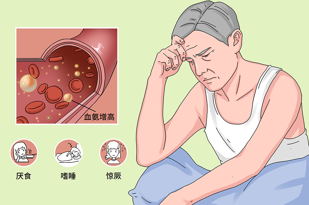 因长期摄入过多含氮的食物或有严重的上消化道出血导致血容量下降,引起肾前性少尿,以致血氨升高。
