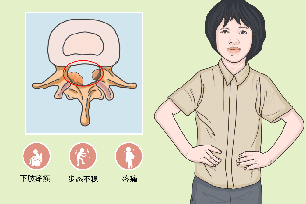 程度不等的单侧或双侧下肢瘫痪、步态不稳、活动无力,腿部麻木等症状。
