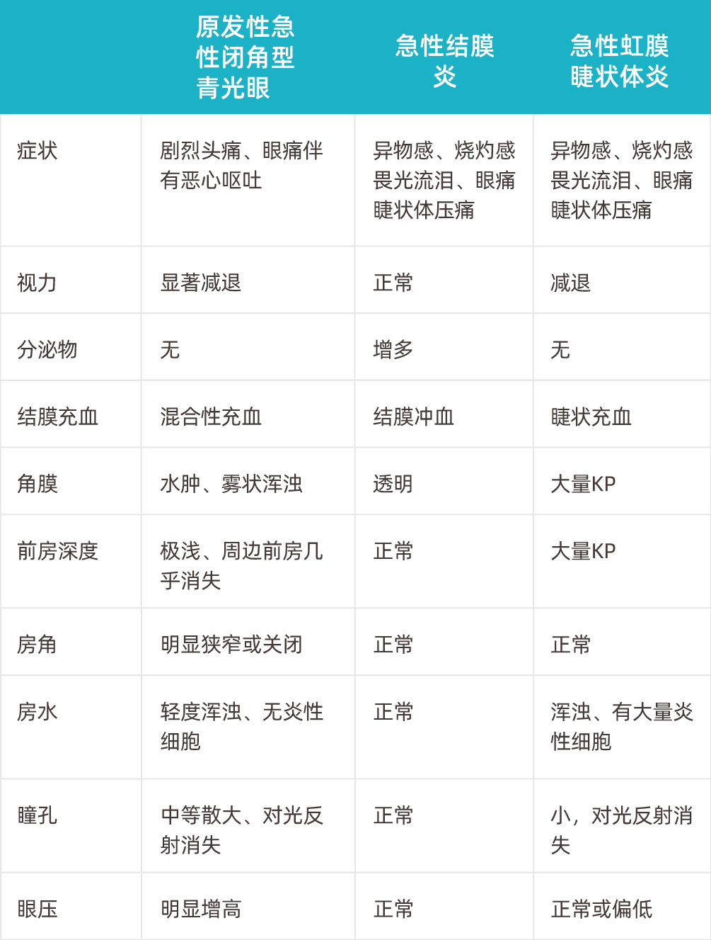 剧烈眼痛、同侧头痛、畏光、流泪、雾视、虹视、视力急剧下降,常仅有指数或手动,伴有恶心、呕吐等全身症状。