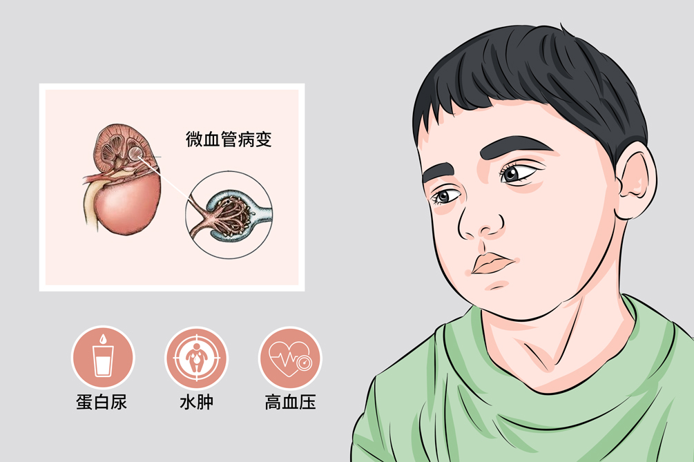 儿童出现多饮、多食、多尿、体重减轻、蛋白尿、水肿、血压升高、头晕眼花、头痛、昏迷、失明等症状时,应及时去儿科就诊,通过血糖检测、肾脏活检、尿常规、眼底检查等诊断为小儿糖尿病肾病,应注意与小儿原发性肾病综合征、尿路感染等疾病鉴别。