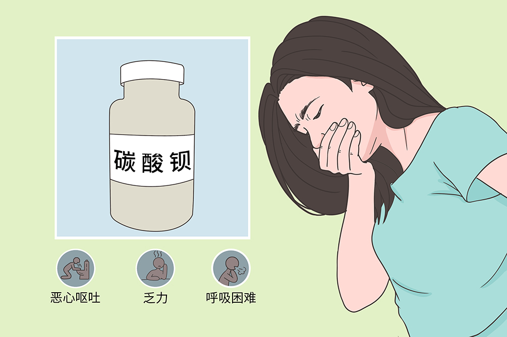 钡是一种略具有光泽的银白色金属,无毒,但可溶性钡盐如氯化钡、硝酸钡、氢氧化钡等及非溶性的碳酸钡对人体却有剧毒,钡的可溶性盐可经呼吸道、损伤的皮肤及主要经消化道进入体内,钡离子吸收入血液后,到达各种组织,以肌肉中含量为最多。碳酸钡虽不溶于水,但可溶于稀盐酸,吞服后与胃内的盐酸反应生成氯化钡而变为有毒。积极治疗后患者可以存活。钡中毒的临床表现为恶心呕吐、全身乏力及心慌、胸闷等,部分患者可出现抽筋、心律紊乱及低钾血症等症状,严重者可直接导致死亡。