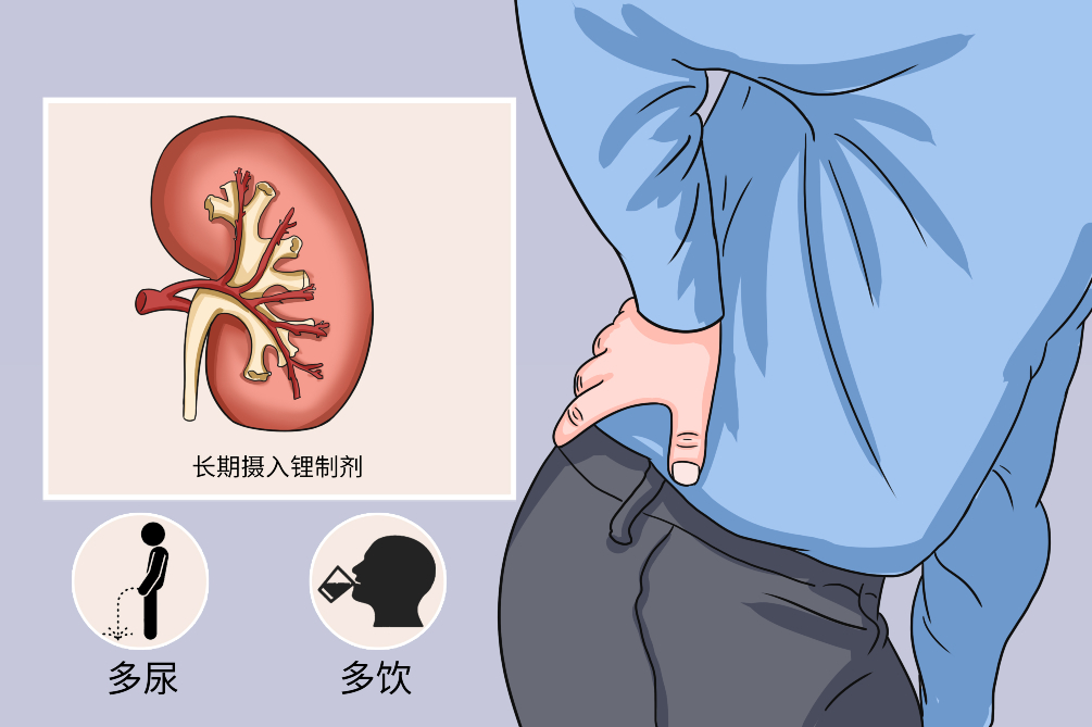 躁狂症患者一般都需要长期服用锂制剂药品,目前有数据显示。长期服用锂制剂药品的患者中,50%会出现可逆性血浆抗利尿激素抵抗,即临床上表现为多尿、多饮。服用锂制剂10~15年会出现显著的肾小球滤过率下降,即肾脏的滤过功能显著减退。长期接受锂制剂药品治疗人群的85%肾小球滤过率正常。