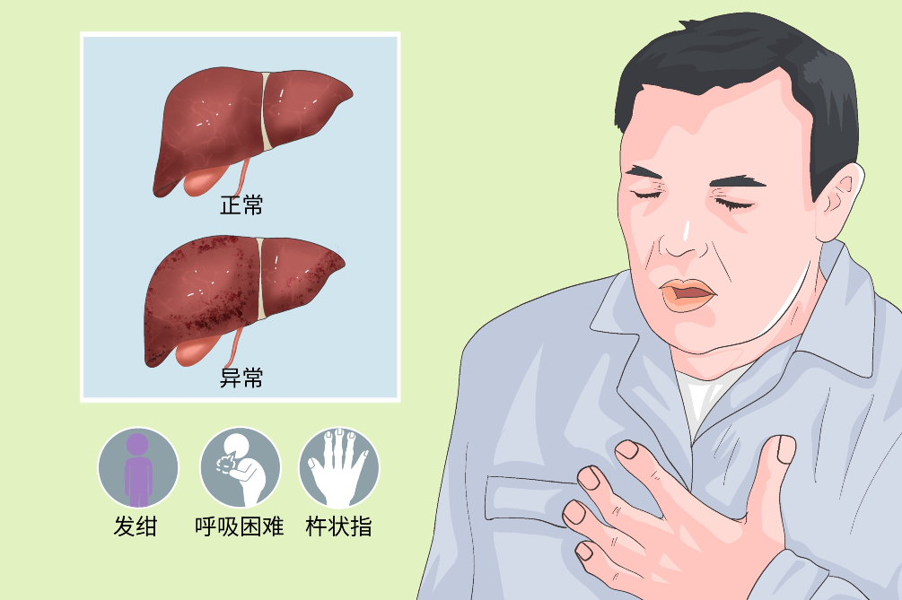 既往有肝硬化病史的患者出现典型发绀-杵状指-肝病症状如呼吸困难、局部皮肤发紫、杵状指、腹水。