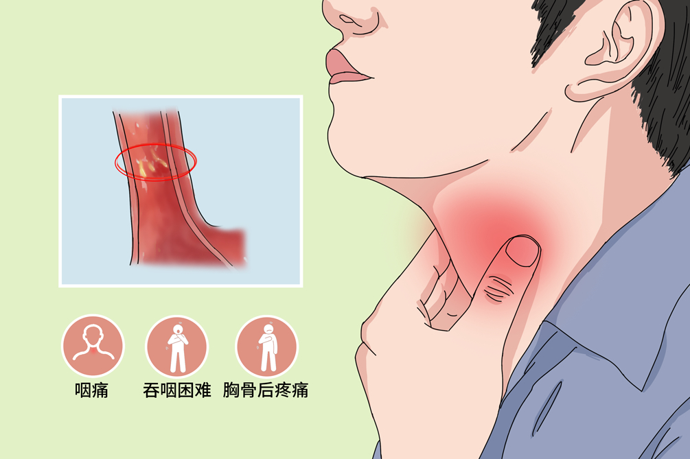是由于念珠菌浸入食管黏膜形成的一种溃疡性假膜性食管炎,常有吞咽困难、吞咽疼痛。内镜下表现为特征性的黏附于食管黏膜的白色假膜或斑点。病理学检查,发现炎症、菌丝及成团的芽殖酵母。通过对患者进行食管分泌物采集检查出分泌物中所含细菌类型可鉴别。