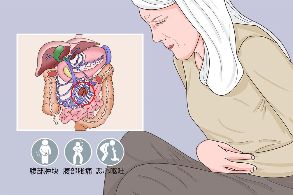 腹部肿块、腹部胀痛、肿瘤压迫症状的典型症状。
