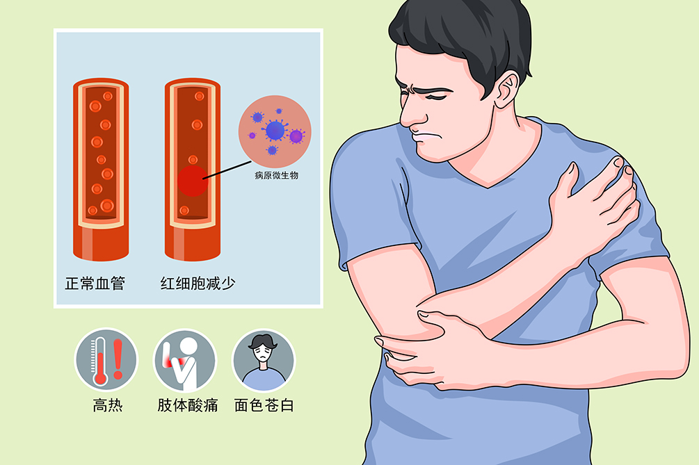 感染性贫血的临床症状有面色苍白、肢体酸痛、高热、疲乏、心悸等,部分患者还可能出现黄疸、肝脾肿大。另外,感染性贫血还可发生休克和贫血性心脏病等并发疾病。