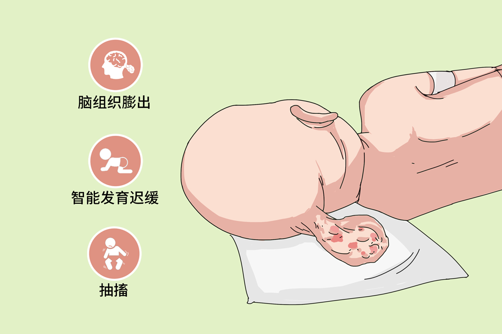 患者出现脑组织膨出、智能发育迟缓、抽搐等症状,请及时前往神经外科就诊。