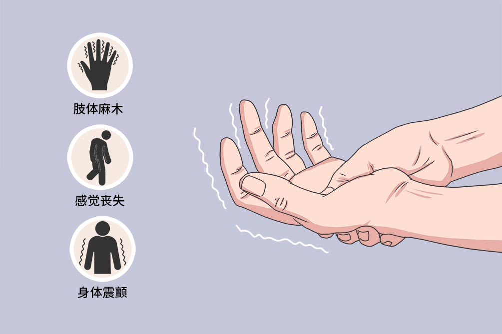 肢体麻痹患者主要症状为肢体麻木、感觉丧失,有时还会存在震颤、痉挛等表现。