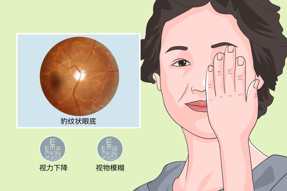 豹纹状眼底是由于视网膜色素上皮内色素少,可透见脉络膜血管,或因脉络膜色素较多,充实于血管间隙内,使脉络膜血管清晰可辨所致,常见于高度近视、视网膜色素变性等疾病。