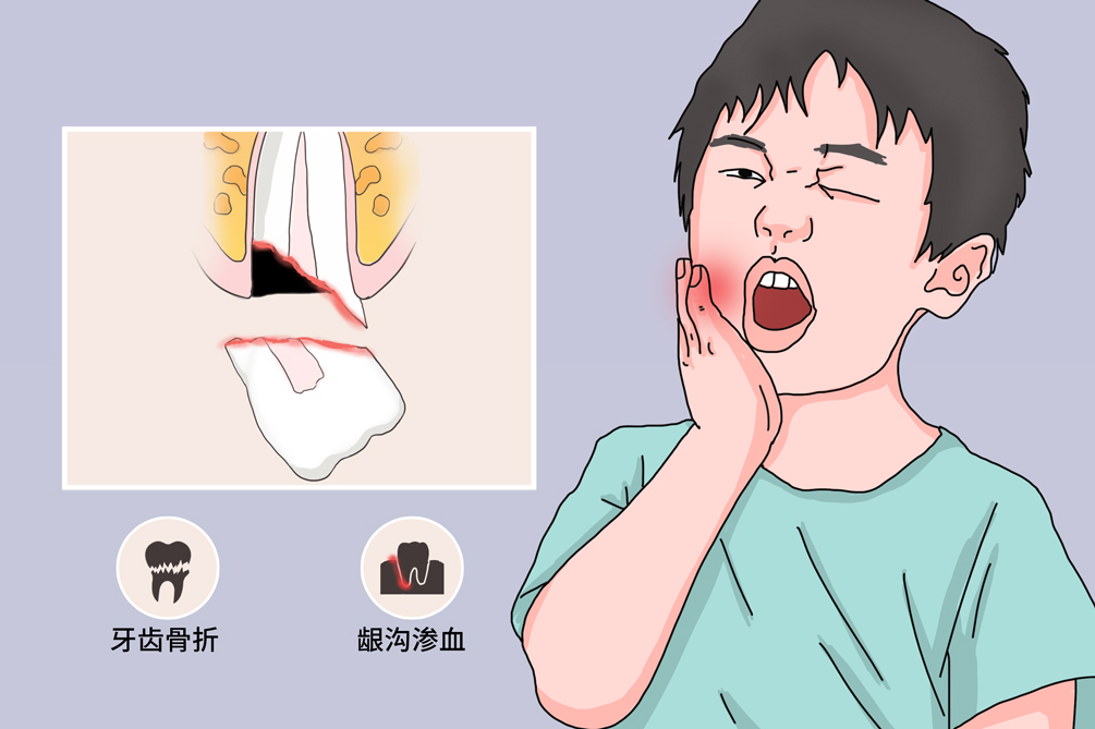 牙齿脱出或嵌入、牙齿缺损面积大,缺损部位渗血,疼痛明显。