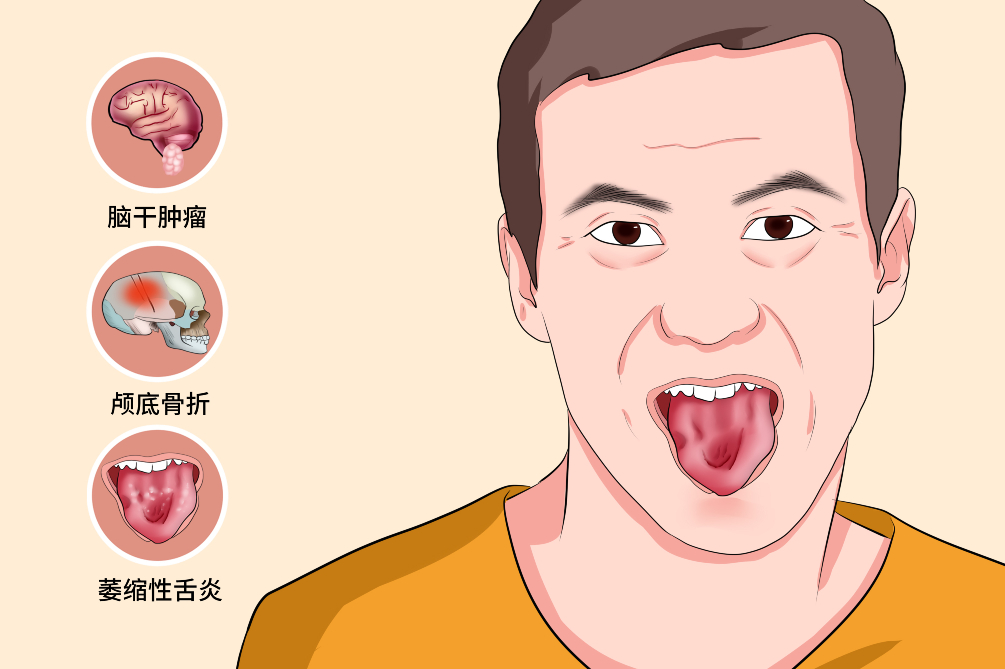 主要症状为说话不清、吃饭喝水时呛咳、吞咽困难、咀嚼无力等症状,部分患者可出现舌体伸出口外,回缩困难等。