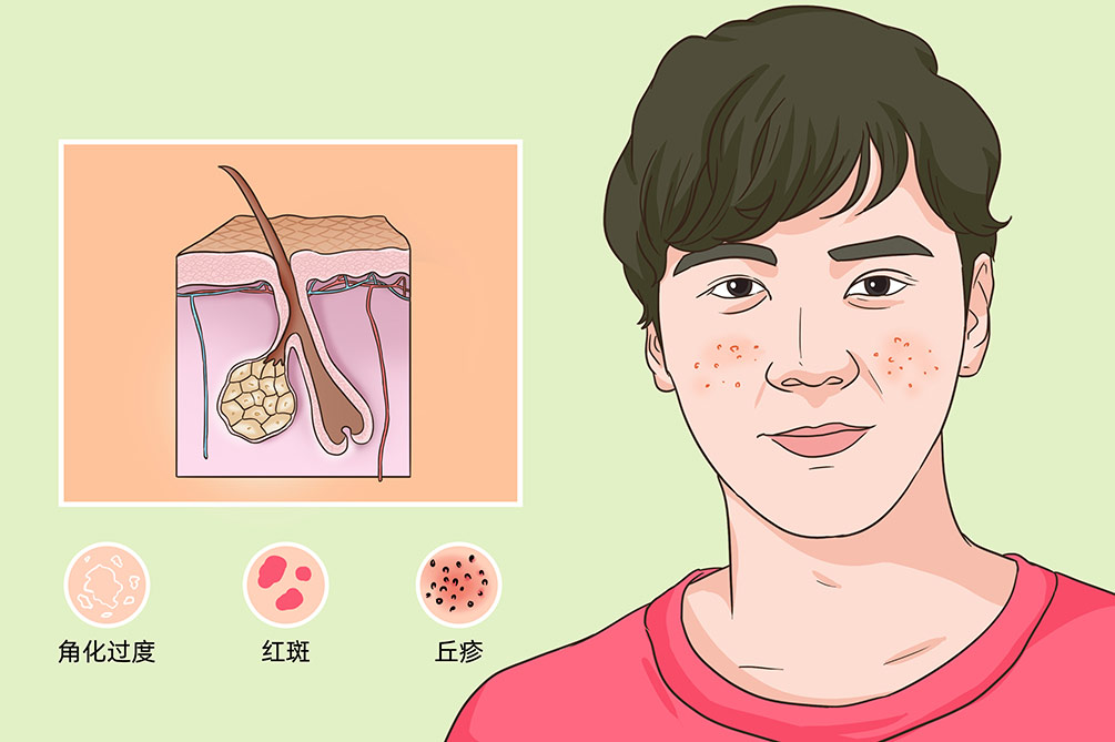 皮肤毛囊口扩大,有角栓形成,且呈逐渐加重趋势,或反复发生;