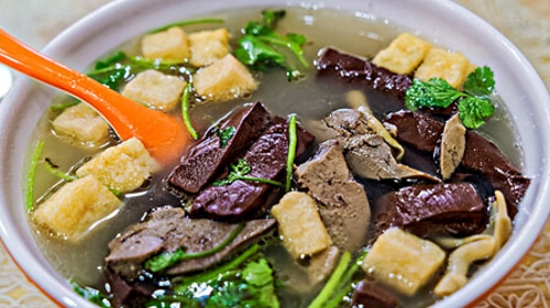鸭血汤中含有丰富的蛋白质及多种人体不能合成的氨基酸,以及红细胞素、微量元素铁等矿物质和多种维生素,这些都是人体造血过程中不可缺少的物质。