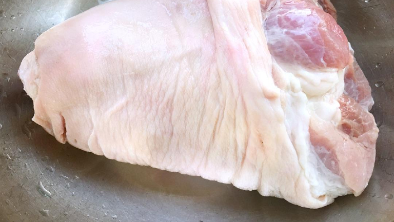 修割猪肘时皮面要留长一点,猪肘的皮面含有丰富的胶质,加热后收缩性较大,而肌肉组织的收缩性则较小。如果皮面与肌肉并齐或是皮面小于肌肉,加热后皮面会收缩变小而脱落,致使肌肉裸露而散碎。因此,皮面要适当留长一点,加热后皮面收缩,恰好包裹住肌肉又不至于脱落,菜肴形体整齐美观。