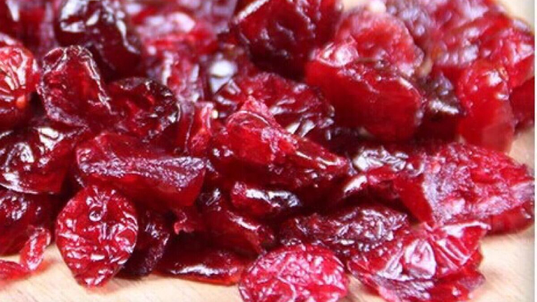 红莓干是加糖脱水的水果产品,色泽红润。以高级红莓生产,加有蔗糖,脱去约14%的水分后,再喷上薄薄的向日葵油。跟一般干果一样,红莓干可以即食,同时可以代替葡萄干,作为食品、菜肴的配料。
