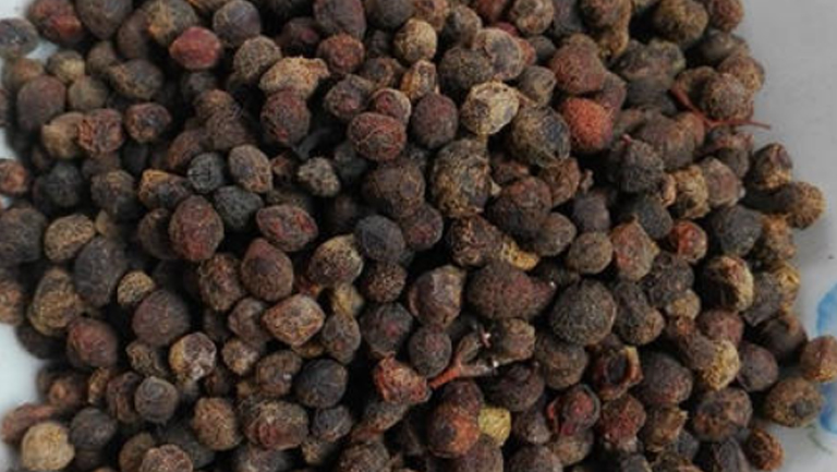 樟木子果实呈圆球形,直径约5-8mm,棕黑色至紫黑色,表面皱缩不平,或有光泽,果皮呈肉质而薄,内含大而黑色的种子,气香、味辛辣。