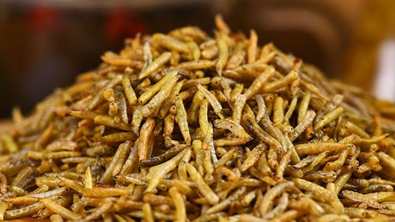 五谷虫的采收是在夏、秋季捞取肥大蛆虫,冲洗漂净,取糖灰撒覆于蛆虫上,使蛆虫体内污物排出,然后将虫体烫熟晒干后,用河沙置锅中炒至大热,将晒干的虫体倒入,炒至膨胀鼓起,筛去河沙、碎屑储存。