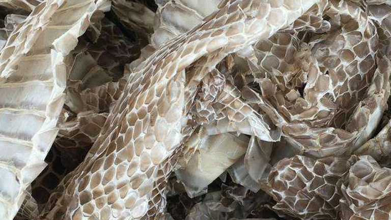 王锦蛇蜕下的干燥表皮膜,含骨胶原,血清中含抗毒因子及酸性蛋白质。