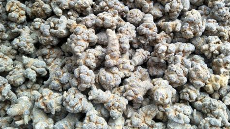 三七块是三七株苗种后第3年冬季及夏末初秋采挖,挖根茎晒干、切断、干燥保存。