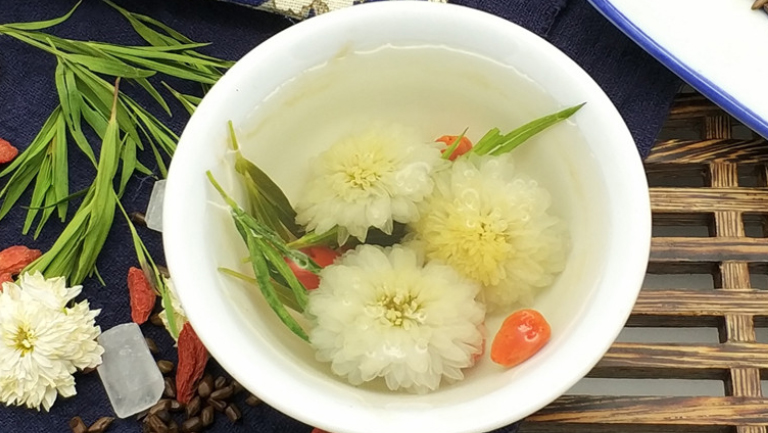 菊花中含有挥发油、菊甙、腺嘌呤、氨基酸、胆碱、水苏碱、小蘖碱、黄酮类、菊色素、维生素、微量元素等物质。甘草主要成分是甘草甜素、甘草次酸、甘草苷元、甘草多糖、甘草浸膏等。枸杞含有丰富的枸杞多糖、β-胡萝卜素、维生素E、硒,以及黄酮类抗氧化物质。