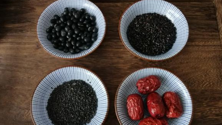 黑芝麻含不饱和脂肪酸,主要为油酸、亚油酸、棕榈酸、硬脂酸、花生酸等甘油脂,并含芝麻素、芝麻林酚素、芝麻酚、胡麻甙、车前糖、芝麻糖等。红枣含蛋白质、碳水化合物、脂肪、钙、磷、铁、胡萝卜素、核黄素、维生素A、维生素B2、维生素C等。
