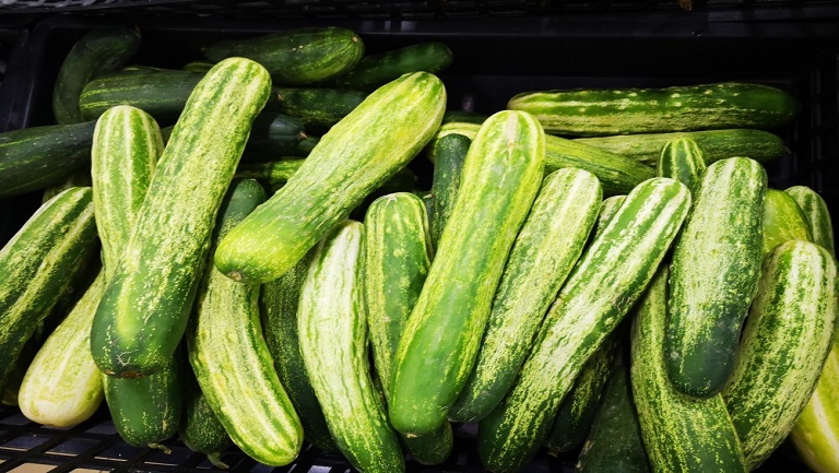 挑选黄瓜时应选择条直、粗细均匀的种类,黄瓜应整齐地摆放在菜篮子里,放到通风、阴凉处。