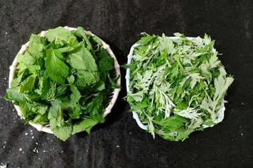 薄荷为唇形科植物薄荷的干燥地上部分,艾草为菊科植物艾的干燥叶,其中薄荷味辛、性凉,归肺、肝经。艾草味辛、苦,性温,归肝、脾、肾经。薄荷和艾草一起煮,即可内服,也可外用,主要有透疹、祛湿止痒、疏肝行气等功效。