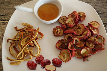 陈皮辛行温通,健脾和中,山楂性温兼入肝经血分,能通行气血,有活血祛瘀止痛之功。红枣药性甘、温,归脾、胃、心经,具有养血安神的作用。可补中益气,缓解气虚血少、面色萎黄、心悸失眠等症状。