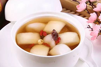 川贝梨汤由川贝、梨子等烹煮而成,川贝于夏、秋二季或积雪融化后采挖,需除去须根、粗皮及泥沙,晒干或低温干燥制成,性微寒,味苦、甘,归肺、心经。梨子味甘、微酸,性凉,由二者制成的川贝梨汤具有止渴、清热化痰、润肺止咳等功效。