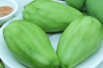 将脆青芒果洗净后,直接剥皮切块,加入辣椒粉搅拌,即可食用。