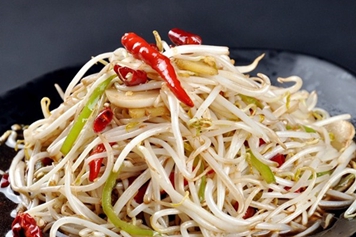 炒豆芽主要以豆芽制成,豆芽通常是指用黄豆、绿豆或者黑豆发的芽。炒豆芽口感清脆,含有较为丰富的营养,具有补充营养、促进排便等功效。