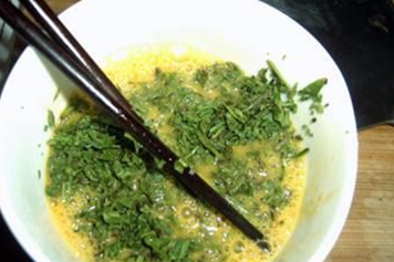 将茶叶切碎,放入打散的鸡蛋中,加入盐调味后上锅煎熟即可。