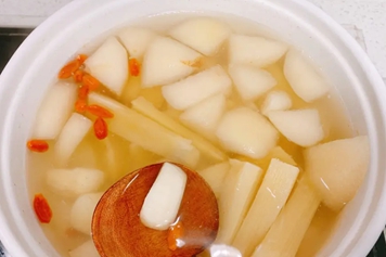 取适量甘蔗去皮、雪梨切块,加入清水炖煮即可服用。