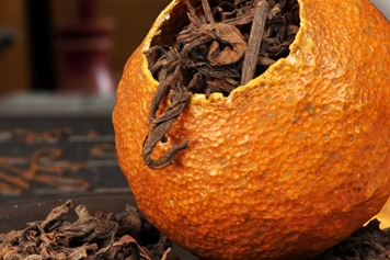 柑橘普洱茶又称柑普茶,是一种将柑橘果肉掏空,内部填塞普洱茶,后经日晒风干的复合茶类,味苦、辛,性温,具有理气健脾、化痰止咳、消积化滞等功效。