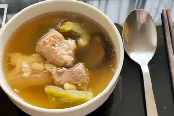 黄豆又叫黄大豆,为豆科植物大豆的黄色种子,具有健脾利水、宽中导滞的功效,苦瓜为葫芦科植物苦瓜的果实,具有清热解暑、促进胃肠道蠕动的功效,猪骨通常指猪棒骨,为猪科动物猪的骨头。黄豆苦瓜煲猪骨汤具有补充营养、促进胃肠道蠕动的功效。