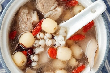 红豆茯苓莲子汤中包含红豆、茯苓、莲子三味药材,其中红豆性平,味甘而酸,归心、小肠经,茯苓与莲子性味归经相似,药性甘平、归脾、肾、心经。红豆茯苓莲子汤具有健脾益气、利水消肿的功效。