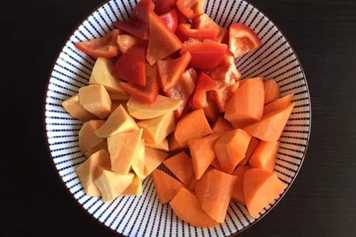 将红薯、胡萝卜切块炒制,炒熟后即可食用。