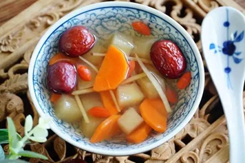 红枣是鼠李科枣属植物枣的成熟果实,枸杞为茄科植物宁夏枸杞的成熟果实,苹果为蔷薇科苹果属植物苹果的果实,生姜为姜科姜属植物姜的新鲜根茎。适当进食红枣枸杞苹果生姜汤,具有补脾益胃、发汗解表等功效。