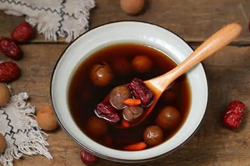 红枣、红糖性温,桂圆性热,红枣入脾、胃经,桂圆、红糖入脾经。适当进食红枣桂圆枸杞红糖水,具有健脾益胃的功效,适用于脾胃虚弱所致的腹胀、面色无华、双目干涩、纳少、嗳气、便溏、腰酸等病症。