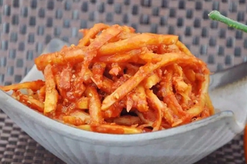 可取适量桔梗放入容器中,加入辣椒、盐腌制成狗宝咸菜,可配合米饭食用。