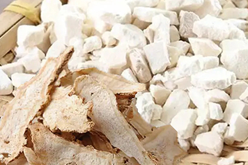 茯苓为多孔菌科真菌茯苓的干燥菌核,味甘、淡,性平,归心、肺、脾、肾经;当归为伞形科植物当归的根,味甘、辛,性温,归肝、心、脾经。茯苓当归合用具有利水渗湿、补血活血、调经止痛等功效。