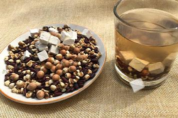 茯苓味甘、淡,性平,归心、肺、脾、肾经;芡实味甘、涩,性平,归脾、肾经;红豆味甘、酸,性平,归心、小肠经;薏米味甘、淡,性凉,归脾、胃、肺经。茯苓芡实红豆薏米茶具有利水渗湿、健脾止泻等功效。
